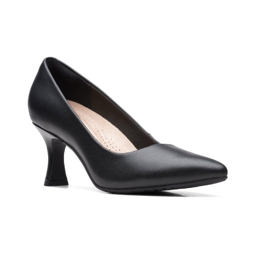 Clark's black leather pump with curved heel and pointed toe.